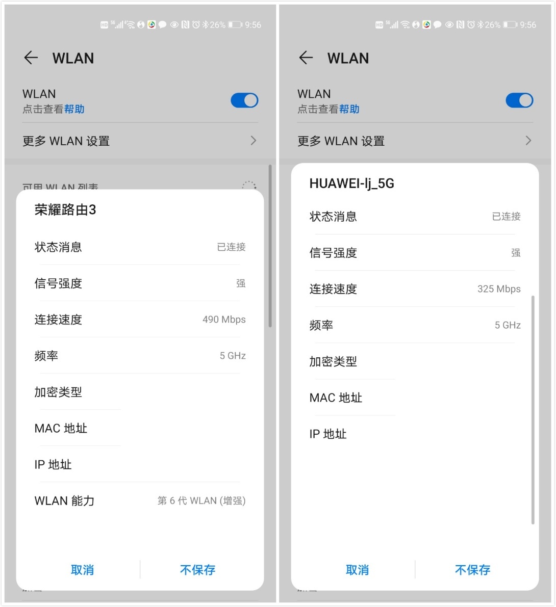 用支持Wi-Fi 6技术的华为P40 Pro连接上WIFI信号,发现通过荣耀路由3的连接速率高达490Mbps,而其它的仅为325Mbps。(PS:连接速率就是传输数据的快慢,手机和路由器之间的连接速率越大,数据交换的速度也就越快。)